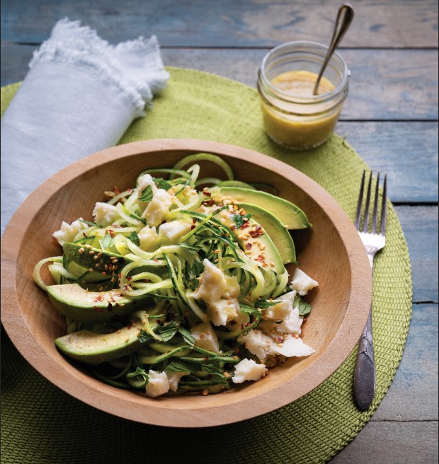 For salad, using spiral slicer or vegetable peeler, spiral slice or peel cucumber lengthwise into long noodles, and then add to serving platter. Peel and slice avocado into wedges, and then nestle into noodles, along with halloumi or feta.